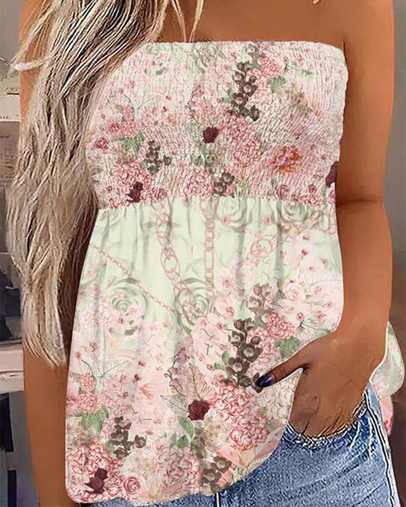 Style:Casual Type:Tank Material:97%Polyester,3%Elastane Neckline:Bandeau Sleeve Style:Sleeveless Length:Regular Pattern Type:Chain,Floral Decoration:Shirred Fit Type:Regular Occasion:Daily Package Include:1*Top Fabric Elasticity:Slight Stretch Sheer:No Care Instructions:Machine wash or professional dry clean