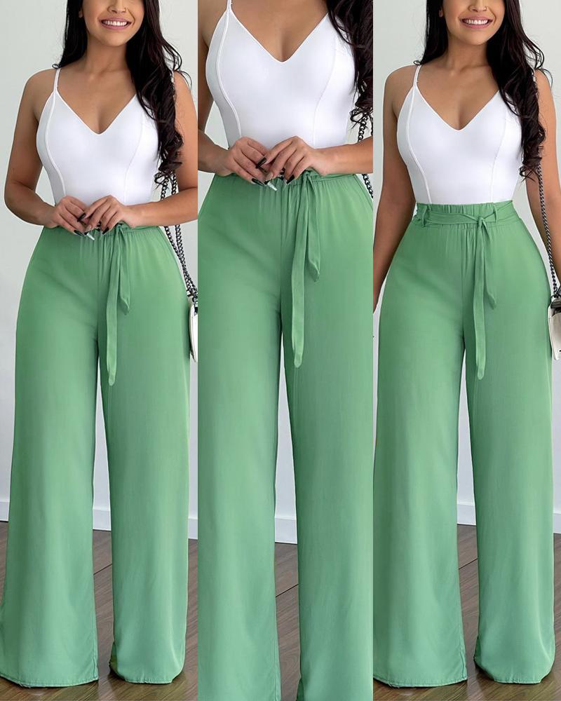 Style:Chic Type:Pants Sets Material:Polyester Neckline:V-Neck Sleeve Style:Spaghetti Strap Length:Long Pattern Type:Plain Decoration:Tied Detail Fit Type:Regular Occasion:Daily Package Include:1*Pants Set Fabric Elasticity:Non-Stretch Sheer:No Care Instructions:Machine wash or professional dry clean Waist Line:High Waist