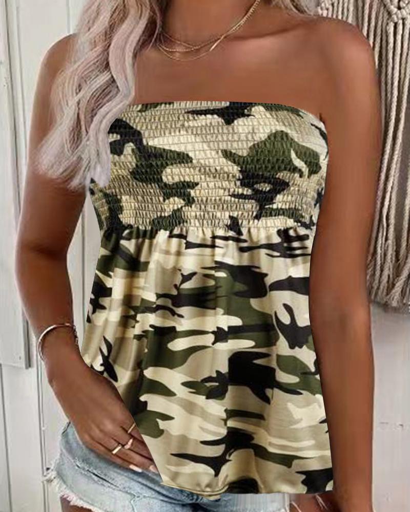 Style:Chic Type:Tank Material:95%Polyester,5%Elastane Neckline:Bandeau Sleeve Style:Sleeveless Length:Regular Pattern Type:Camouflage Decoration:Shirred Fit Type:Regular Occasion:Daily,Vacation Package Include:1*Top Fabric Elasticity:Non-Stretch