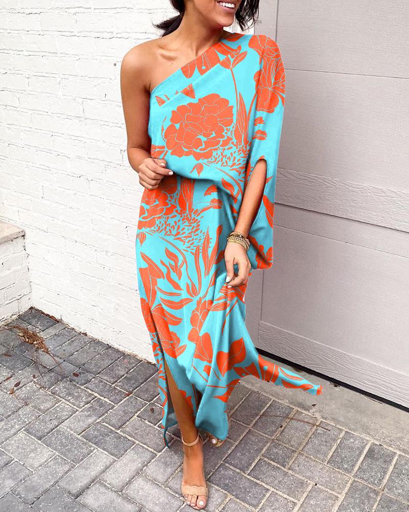Style:Casual,Chic Type:Slit,Straight Material:100%Polyester Neckline:One Shoulder Sleeve Style:Batwing Sleeve,Long Sleeve Length:Maxi Pattern Type:Plants Decoration:Batwing Sleeve,Slit Fit Type:Regular Occasion:Daily,Vacation Package Include:1* Dress Fabric Elasticity:Slight Stretch