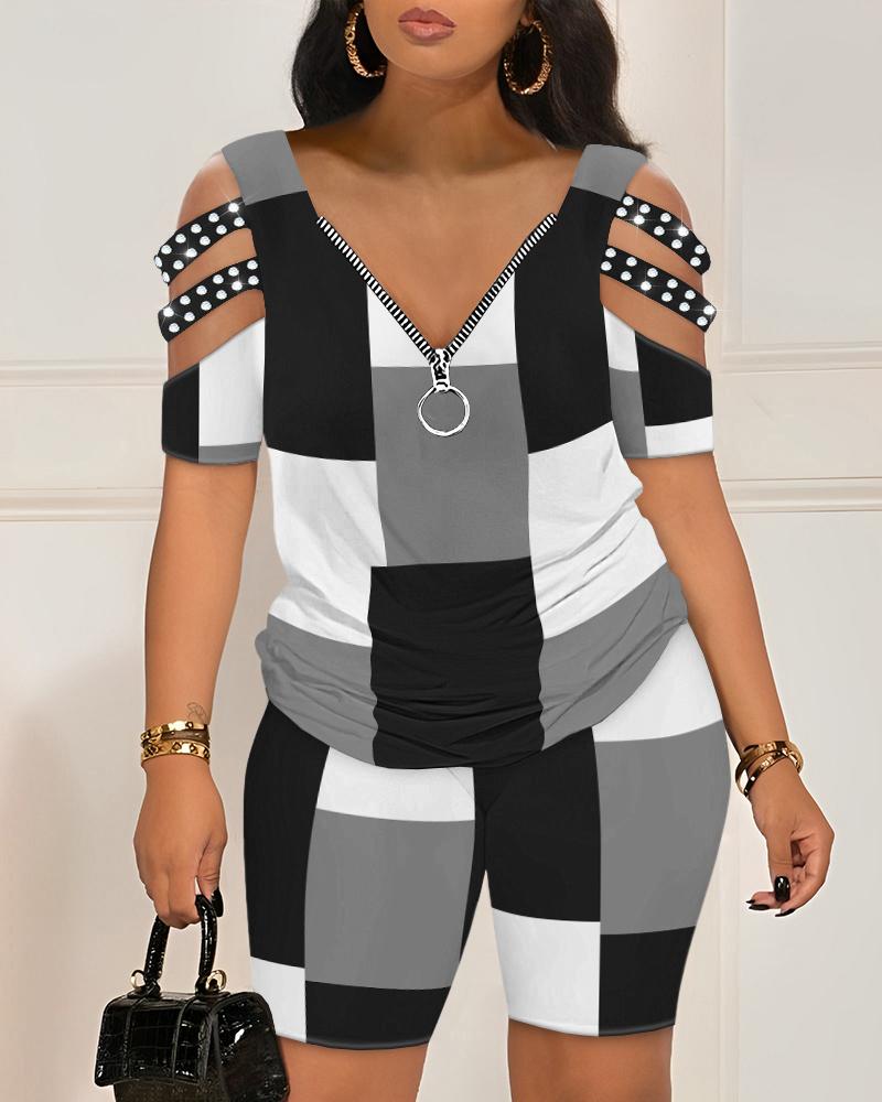 Style:Casual Type:Shorts Set Material:97%Polyester,3%Spandex Neckline:Cold Shoulder Sleeve Style:Short Sleeve Length:Above Knee Pattern Type:Geometric Decoration:Cutout,Zipper Fit Type:Regular Occasion:Daily Package Include:1*Shorts Set Fabric Elasticity:Slight Stretch Sheer:Yes Care Instructions:Machine wash or professional dry clean