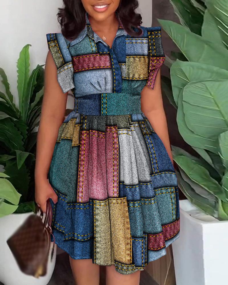 Denim Look Print Flutter Sleeve Pleated Casual Dress