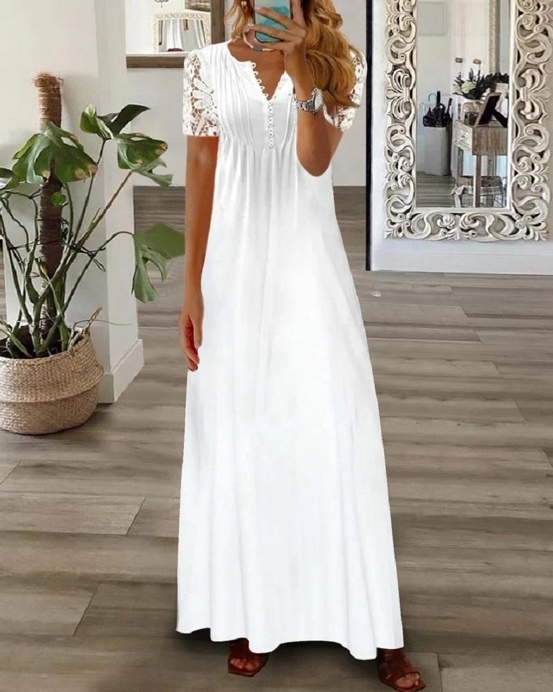 Style:Chic Type:A Line Material:Polyester Neckline:Round Neck Sleeve Style:Short Sleeve Length:Maxi Pattern Type:Plain Decoration:Contrast Lace Fit Type:Regular Occasion:Daily Package Include:1* Dress