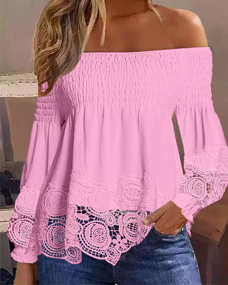 Style:Casual Type:Blouses Material:100%Polyester Neckline:Off the Shoulder Sleeve Style:Long Sleeve Length:Regular Pattern Type:Plain Decoration:Contrast Lace,Frill Hem,Shirred Fit Type:Regular Occasion:Daily Package Include:1* Blouse Fabric Elasticity:Slight Stretch Sheer:No Care Instructions:Machine wash, do not dry clean