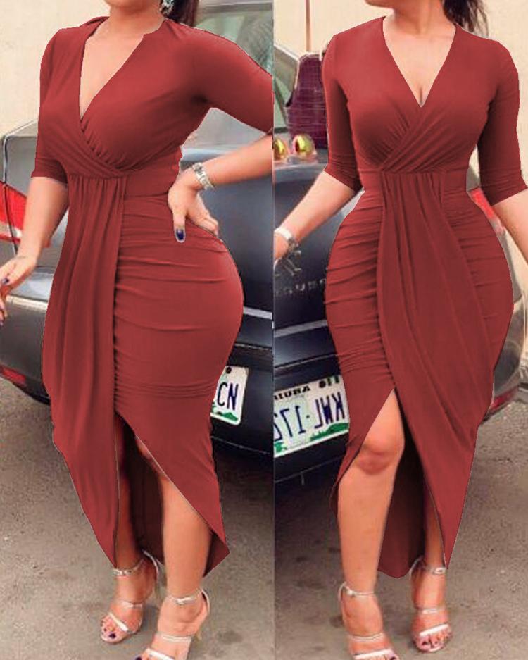 Style:Sexy Type:Slit Material:100% Polyester Neckline:Deep V Neck Sleeve Style:Long Sleeve Length:Asymmetrical Pattern Type:Plain Decoration:Ruched, Tulip Hem Fit Type:Skinny Occasion:Party Package Include:1* Dress Note: There might be 2-3% difference according to manual measurement. Please check the measurement chart carefully before you buy the item. +Please note that slight color difference should be acceptable due to the light and screen.