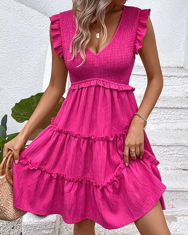 Style:Casual Type:Smock Material:Polyester Neckline:V-Neck Sleeve Style:Sleeveless Length:Mini Pattern Type:Plants Decoration:Shirred,Frill Hem Fit Type:Regular Occasion:Daily Package Include:1* Dress Fabric Elasticity:Slight Stretch Sleeve Type:Flutter Sleeve Sheer:No Care Instructions:Machine wash or professional dry clean