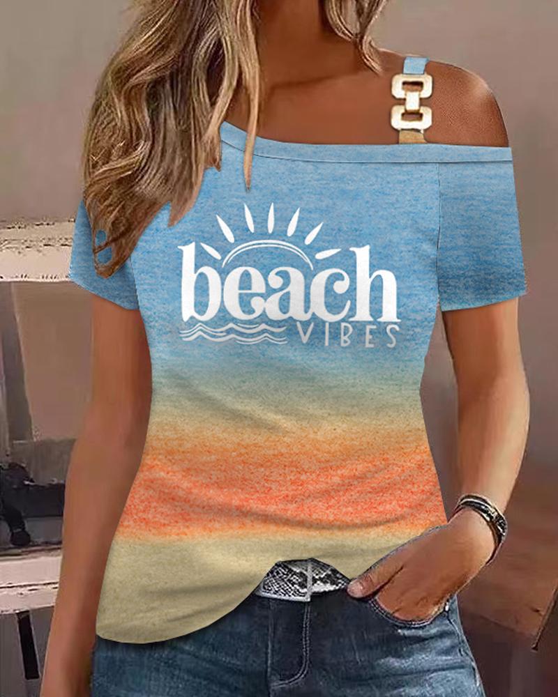 Style:Casual Type:Tee Material:97%Polyester,3%Spandex Neckline:Cold Shoulder Sleeve Style:Short Sleeve Length:Regular Pattern Type:Landscape,Letter,Ombre Decoration:Chain Fit Type:Regular Occasion:Daily Package Include:1*T-Shirt Fabric Elasticity:Non-Stretch Sheer:No Care Instructions:Machine wash or professional dry clean