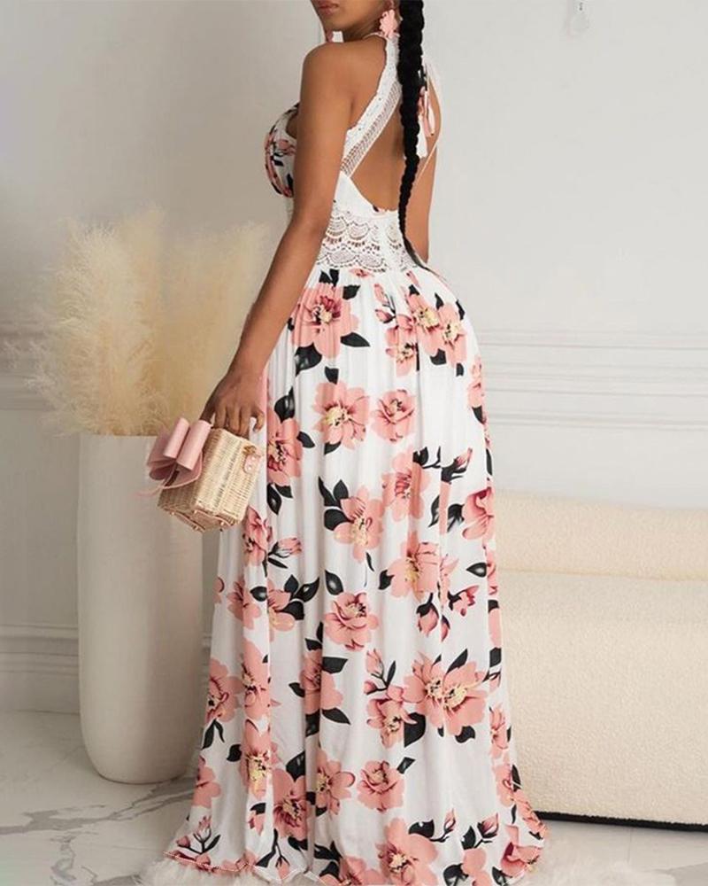 Style:Chic Type:A Line Material:100%Polyester Neckline:Halter Sleeve Style:Sleeveless Length:Maxi Pattern Type:Floral Decoration:Lace Fit Type:Regular Occasion:Daily,Wedding Guest Package Include:1* Dress Fabric Elasticity:Slight Stretch Sheer:No Care Instructions:Machine wash or professional dry clean