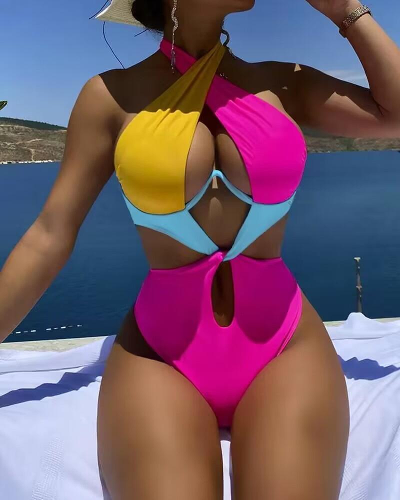 Colorblock Cutout Backless Halter One-Piece Swimsuit