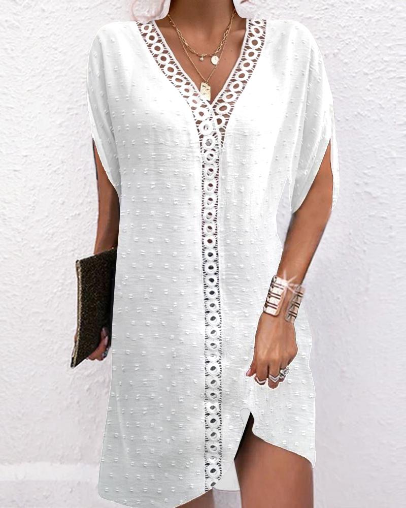 Style:Casual,Chic Type:Straight Material:100%Polyester Neckline:V-Neck Sleeve Style:Half Sleeve Length:Mini Pattern Type:Contrast Paneled Decoration:Contrast Lace,Hollow-out Fit Type:Regular Occasion:Daily Package Include:1* Dress Fabric Elasticity:High Stretch Sheer:No Care Instructions:Machine wash or professional dry clean Waist Line:Natural