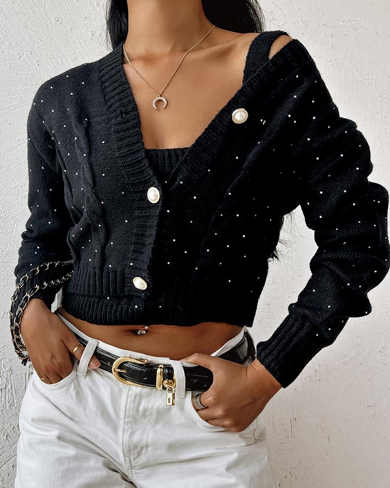 Rhinestone Decor Buttoned Crop Cardigan With Tank Top