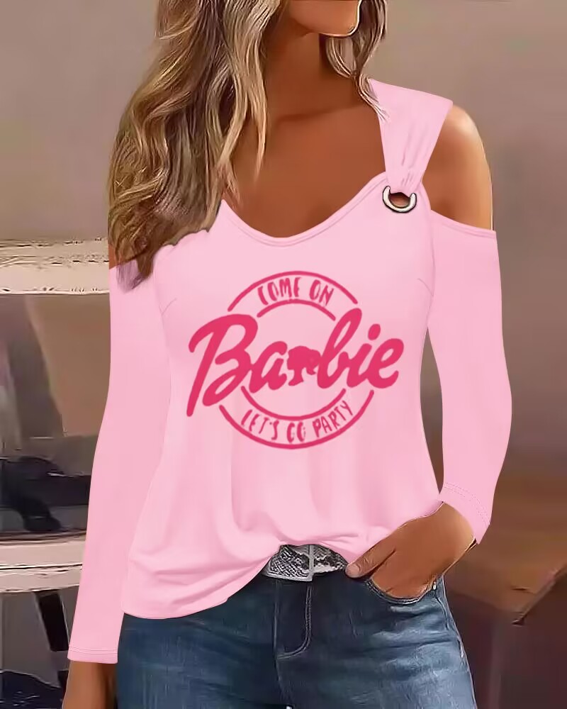 Barbie Letter Print Cold Shoulder Eyelet Casual Top