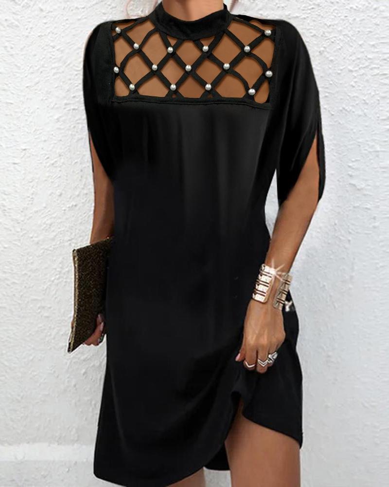 Style:Casual,Chic Type:Straight Material:97%Polyester,3%Spandex Neckline:Mock Neck Sleeve Style:Half Sleeve Length:Mini Pattern Type:Plain Decoration:Hollow-out,Pearls Fit Type:Regular Occasion:Daily Package Include:1* Dress Fabric Elasticity:Slight Stretch Sheer:No Care Instructions:Machine wash or professional dry clean Waist Line:Natural