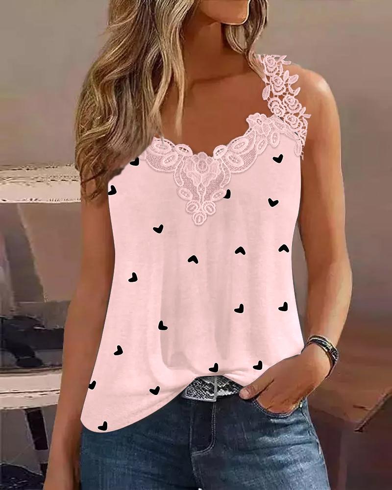 Style:Casual,Chic Type:Tank Material:97%Polyester,3%Spandex Neckline:V-Neck Sleeve Style:Sleeveless Length:Regular Pattern Type:Heart Decoration:Contrast Lace Fit Type:Regular Occasion:Daily Package Include:1*Top Fabric Elasticity:Slight Stretch Sheer:No Care Instructions:Machine wash or professional dry clean