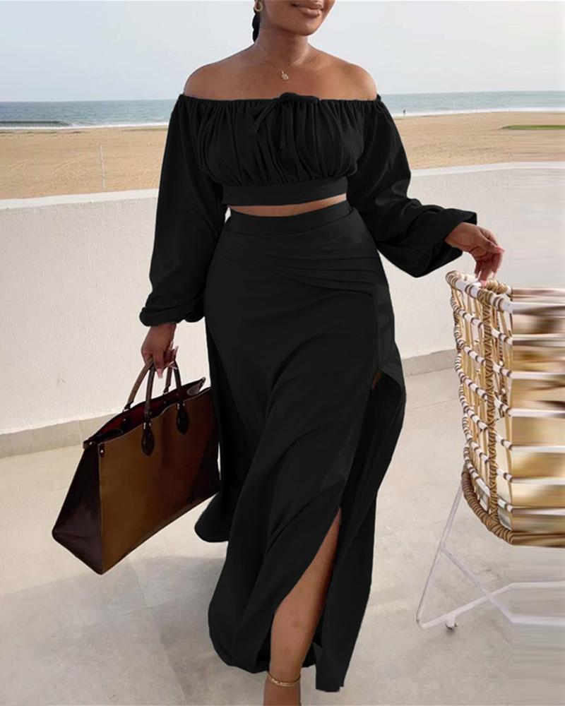 Style:Chic Type:Skirt Sets Material:100%Polyester Neckline:Off the Shoulder Sleeve Style:Long Sleeve Length:Maxi Pattern Type:Plain Decoration:Drawstring,Ruched,Slit Fit Type:Regular Occasion:Beach,Vacation Package Include:1*Skirt Set Fabric Elasticity:High Stretch Sleeve Type:Lantern Sleeve Sheer:No Care Instructions:Machine wash or professional dry clean Waist Line:High Waist