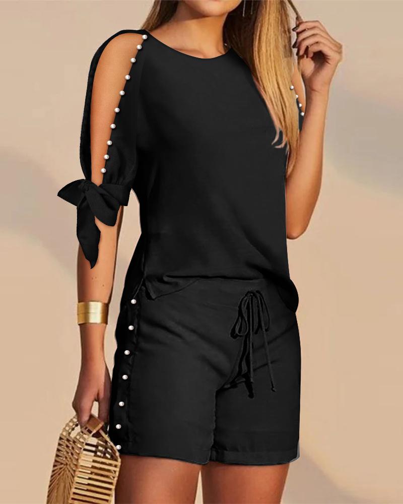 Pearls Decor Split Sleeve Top & Drawstring Shorts Set