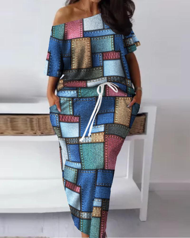 Style:Casual Type:Skirt Sets Material:97%Polyester,3%Spandex Neckline:Skew Neck Sleeve Style:Short Sleeve Length:Maxi Pattern Type:All Over Print,Colorblock Decoration:Drawstring,Pocket Fit Type:Oversized Occasion:Daily Package Include:1*Skirt Set Fabric Elasticity:Non-Stretch Sheer:No Care Instructions:Machine wash or professional dry clean