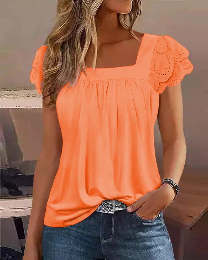 Style:Basics,Casual Type:Tank Material:97%Polyester,3%Spandex Neckline:Square Neck Sleeve Style:Short Sleeve Length:Regular Pattern Type:Plain Decoration:Eyelet Embroidery,Ruched Fit Type:Regular Occasion:Daily,Vacation Package Include:1*Top Fabric Elasticity:Non-Stretch Sheer:No Care Instructions:Machine wash or professional dry clean