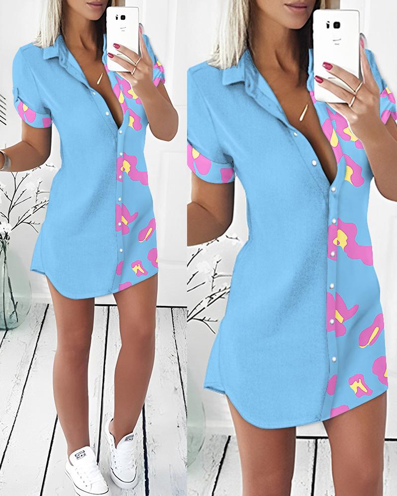 Style:Casual Type:Shirt Material:100%Polyester Neckline:Turn-down Collar Sleeve Style:Short Sleeve Length:Mini Pattern Type:Colorblock,Leopard Decoration:Button Fit Type:Regular With Belt:No Occasion:Daily Package Include:1* Dress Fabric Elasticity:Slight Stretch Sheer:No Care Instructions:Machine wash or professional dry clean