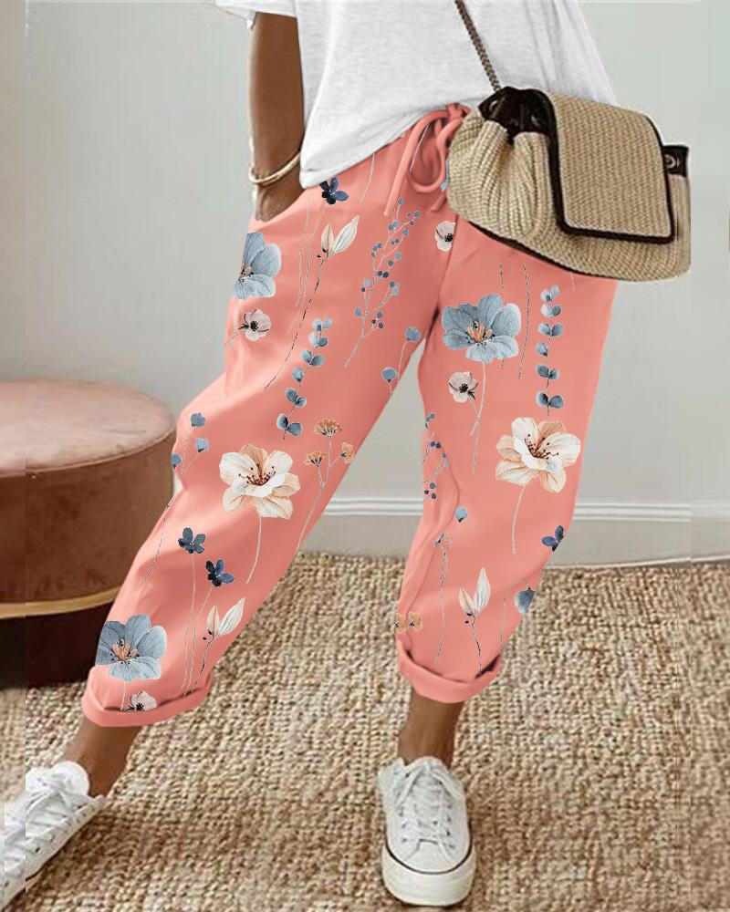 Floral Print Drawstring Cuffed Pants