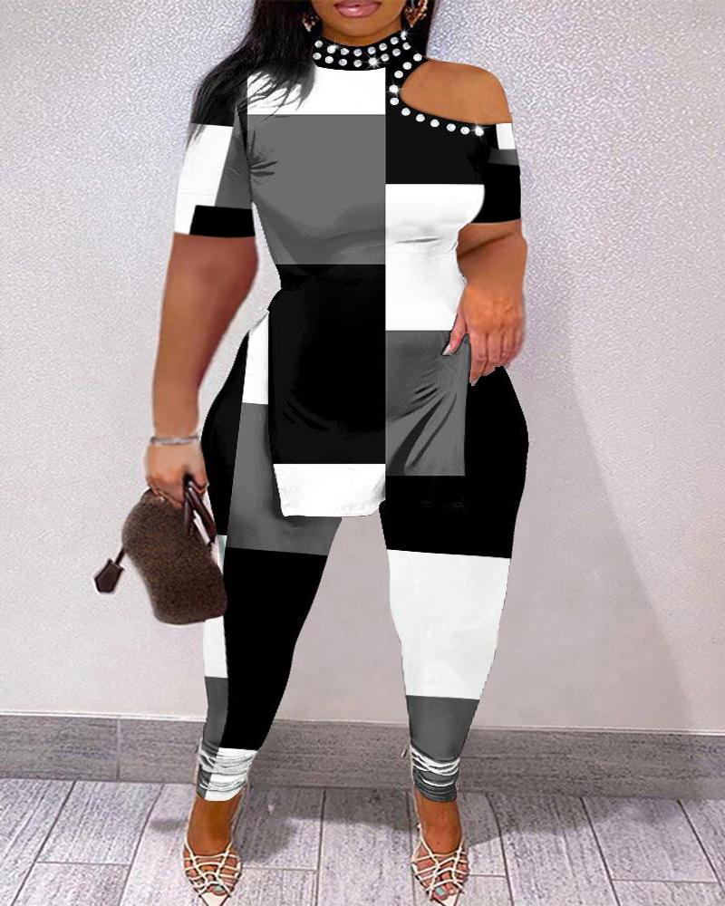 Style:Casual Type:Pants Sets Material:97%Polyester,3%Spandex Neckline:Cold Shoulder Sleeve Style:Short Sleeve Length:Long Pattern Type:Geometric,Colorblock Decoration:Slit,Rhinestone Fit Type:Skinny Occasion:Daily Package Include:1*Pants Set Fabric Elasticity:Non-Stretch