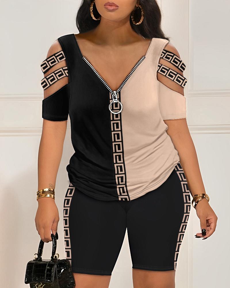 Style:Casual Type:Shorts Set Material:97%Polyester,3%Spandex Neckline:Cold Shoulder Sleeve Style:Short Sleeve Length:Above Knee Pattern Type:Colorblock,Geometric Decoration:Cutout,Zipper Fit Type:Regular Occasion:Daily Package Include:1*Shorts Set Fabric Elasticity:Slight Stretch Sheer:Yes Care Instructions:Machine wash or professional dry clean