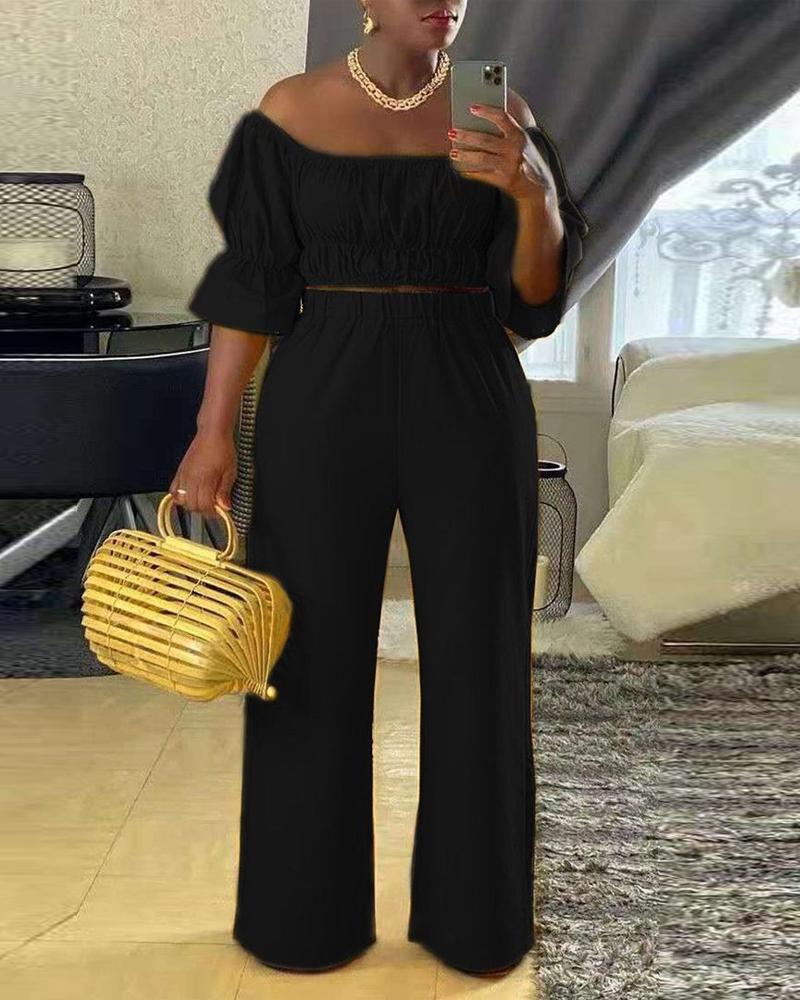 Style:Casual,Chic Type:Pants Sets Material:100%Polyester Neckline:Square Neck Sleeve Style:Half Sleeve Length:Long Pattern Type:Plain Decoration:Ruched Fit Type:Regular Occasion:Daily,Vacation Package Include:1*Pants Set Fabric Elasticity:Slight Stretch Sleeve Type:Bell Sleeve,Puff Sleeve Sheer:No Care Instructions:Machine wash or professional dry clean Waist Line:High Waist