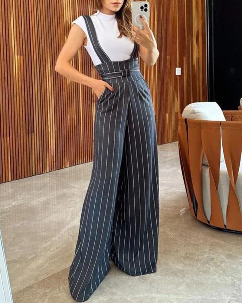 Style:Elegant Type:Jumpsuit Material:100%Polyester Neckline:Asymmetrical Neck Sleeve Style:Sleeveless Length:Long Pattern Type:Striped Decoration:Pocket Fit Type:Regular Occasion:Work Package Include:1*Suspender Jumpsuit Fabric Elasticity:Medium Stretch Sheer:No Care Instructions:Machine wash or professional dry clean