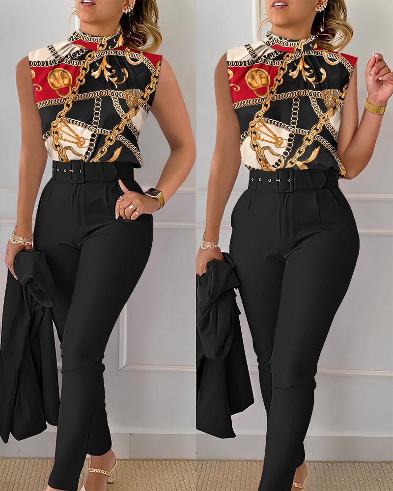 Style:Chic,Elegant,Vintage Type:Pants Sets Material:97%Polyester,3%Spandex Neckline:Mock Neck Sleeve Style:Sleeveless Length:Long Pattern Type:Baroque,Chain Decoration:Pocket Fit Type:Regular With Belt:Yes Occasion:Daily,Work Package Include:1*Pants Sets(Without Coat) Fabric Elasticity:Medium Stretch Sheer:No Care Instructions:Machine wash or professional dry clean Waist Line:High Waist