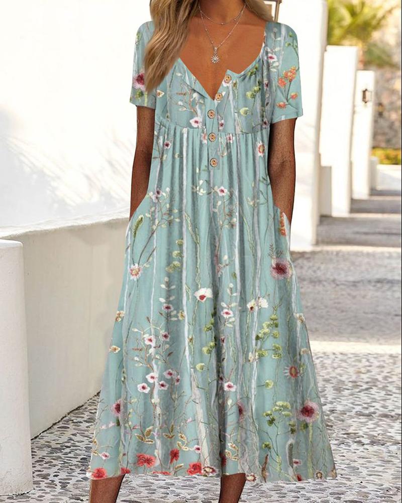 Style:Casual Type:A Line Material:97%Polyester,3%Spandex Neckline:V-Neck Sleeve Style:Short Sleeve Length:Mid-Calf Pattern Type:Floral Decoration:Button,Pocket,Ruched Fit Type:Regular Occasion:Daily Package Include:1* Dress Fabric Elasticity:Slight Stretch Sheer:No Care Instructions:Machine wash or professional dry clean Waist Line:Natural