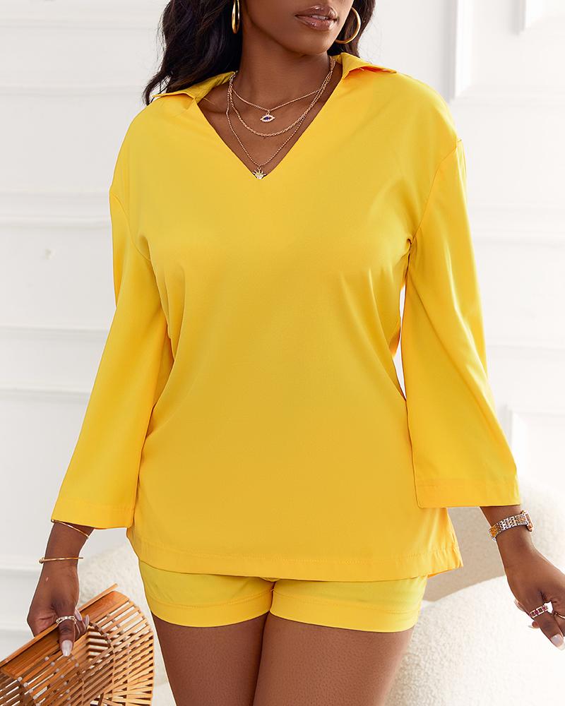 Style:Casual Type:Shorts Set Material:100%Polyester Neckline:V-Neck Sleeve Style:Bell Sleeve,Long Sleeve Length:Above Knee Pattern Type:Plain Decoration:Bell Sleeve Fit Type:Regular Occasion:Daily Package Include:1*Shorts Set Fabric Elasticity:Non-Stretch Sheer:No Care Instructions:Machine wash or professional dry clean