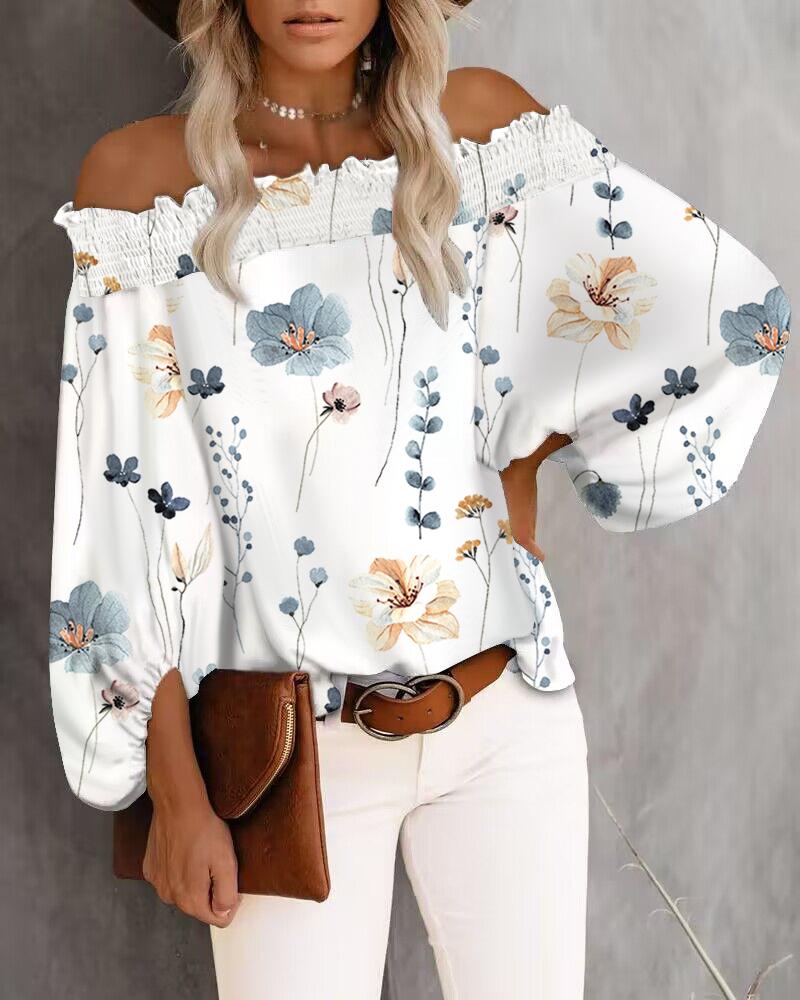 Style:Casual,Chic Type:Blouses Material:100%Polyester Neckline:Off the Shoulder Sleeve Style:Long Sleeve Length:Regular Pattern Type:Floral Decoration:Frill Hem,Lantern Sleeve,Shirred Fit Type:Regular Occasion:Daily Package Include:1* Blouse Fabric Elasticity:Slight Stretch Sleeve Type:Lantern Sleeve Sheer:No Care Instructions:Machine wash or professional dry clean