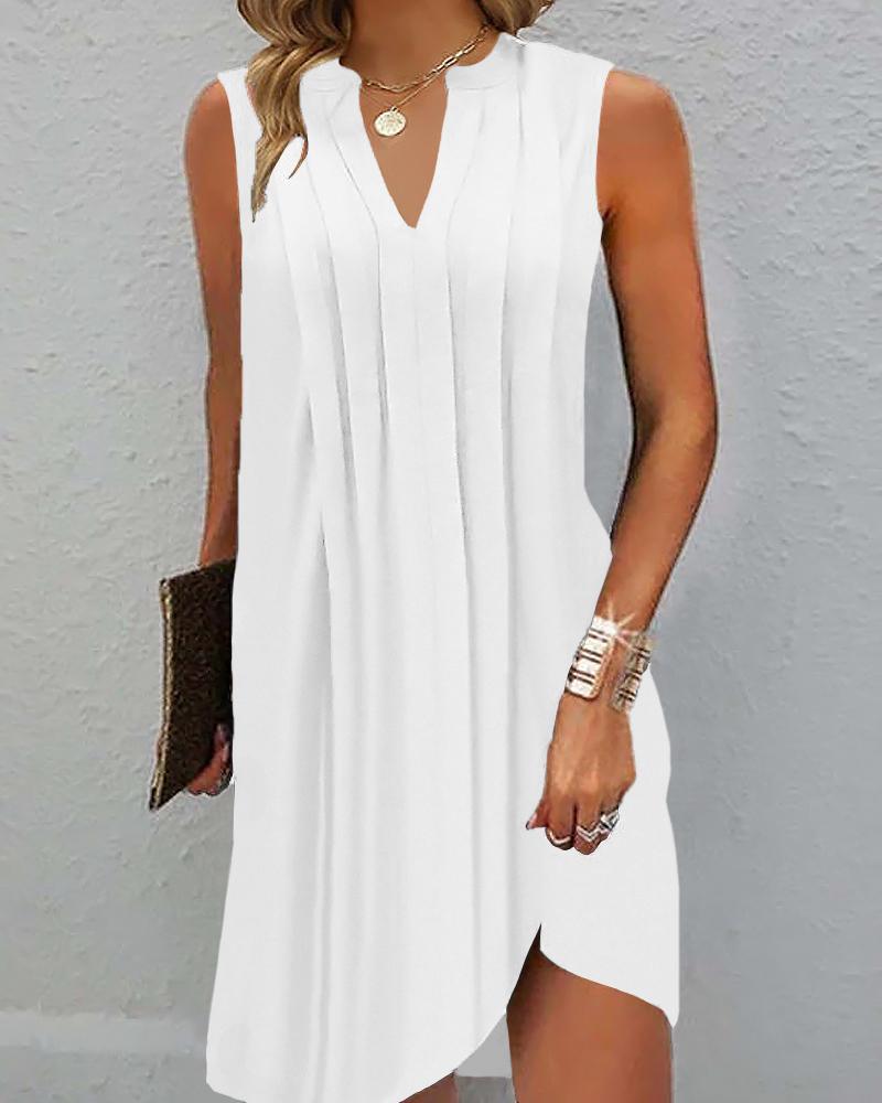 Style:Casual Type:Straight Material:100%Polyester Neckline:Notch Neck Sleeve Style:Sleeveless Length:Mini Pattern Type:Plain Decoration:Ruched Fit Type:Regular Occasion:Daily Package Include:1* Dress Fabric Elasticity:High Stretch