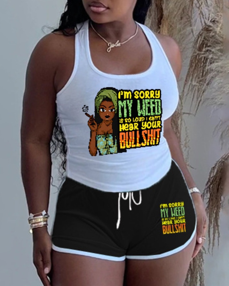 Style:Casual Type:Shorts Set Material:97%Polyester,3%Spandex Neckline:Round Neck Sleeve Style:Sleeveless Length:Above Knee Pattern Type:Graphic,Letter,Figure Decoration:Drawstring,Contrast Binding Fit Type:Regular Occasion:Daily Package Include:1*Shorts Set Fabric Elasticity:Slight Stretch Sheer:No Care Instructions:Machine wash or professional dry clean Waist Line:High Waist