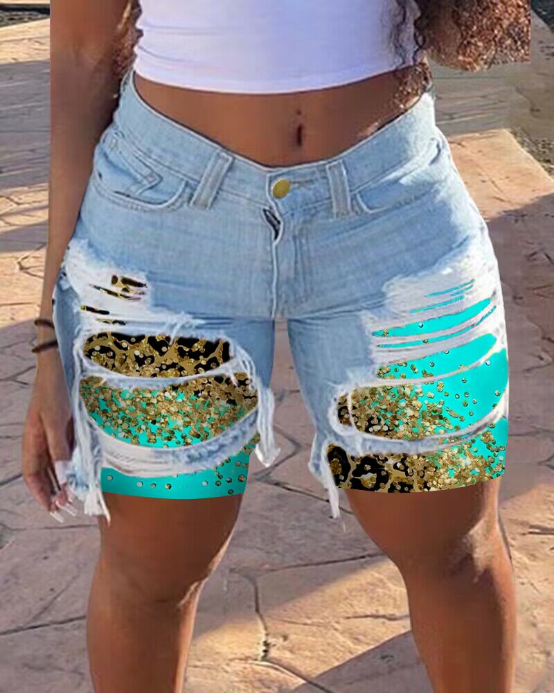 Baseball Leopard Print Patchwork Ripped Denim Shorts