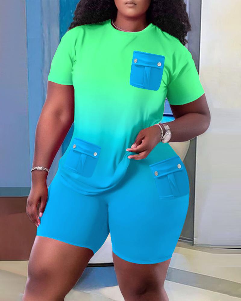 Plus Size Ombre Tie Dye Print Pocket Design Top & Shorts Set