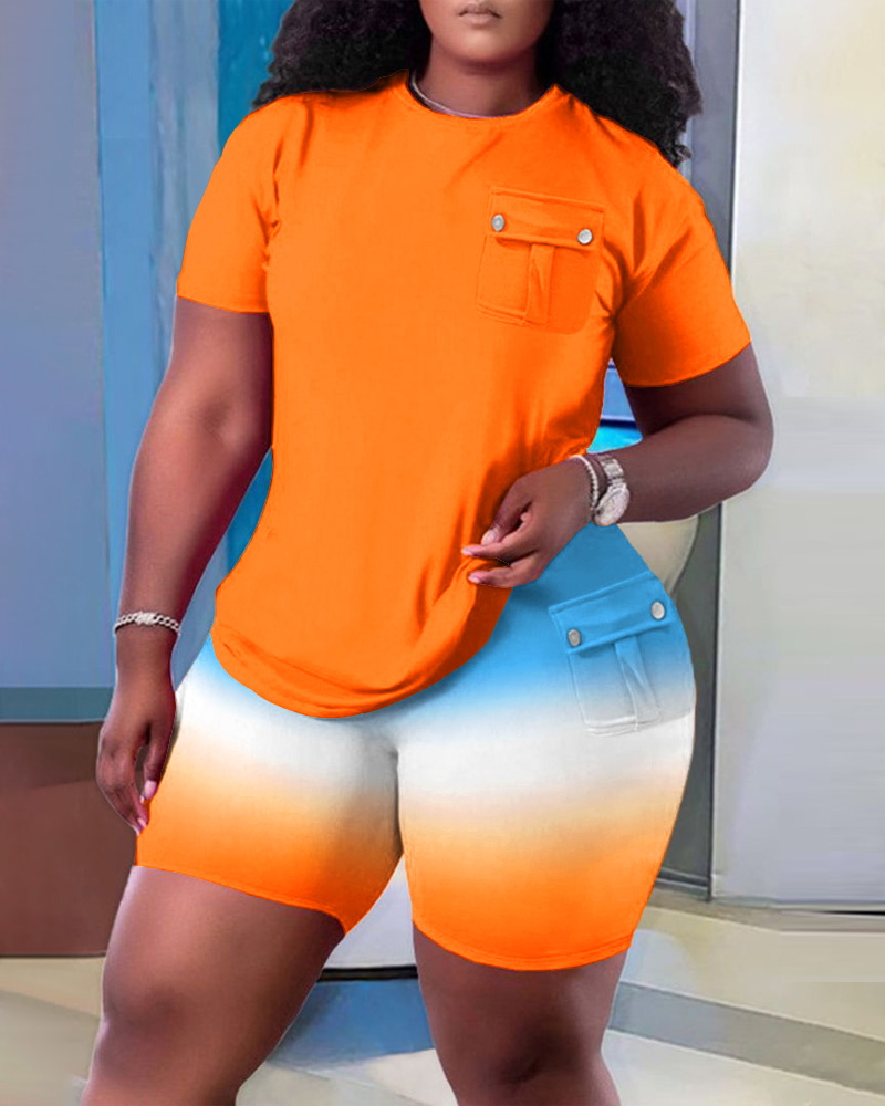 Plus Size Marble Print Casual Top & Pocket Design Shorts Set