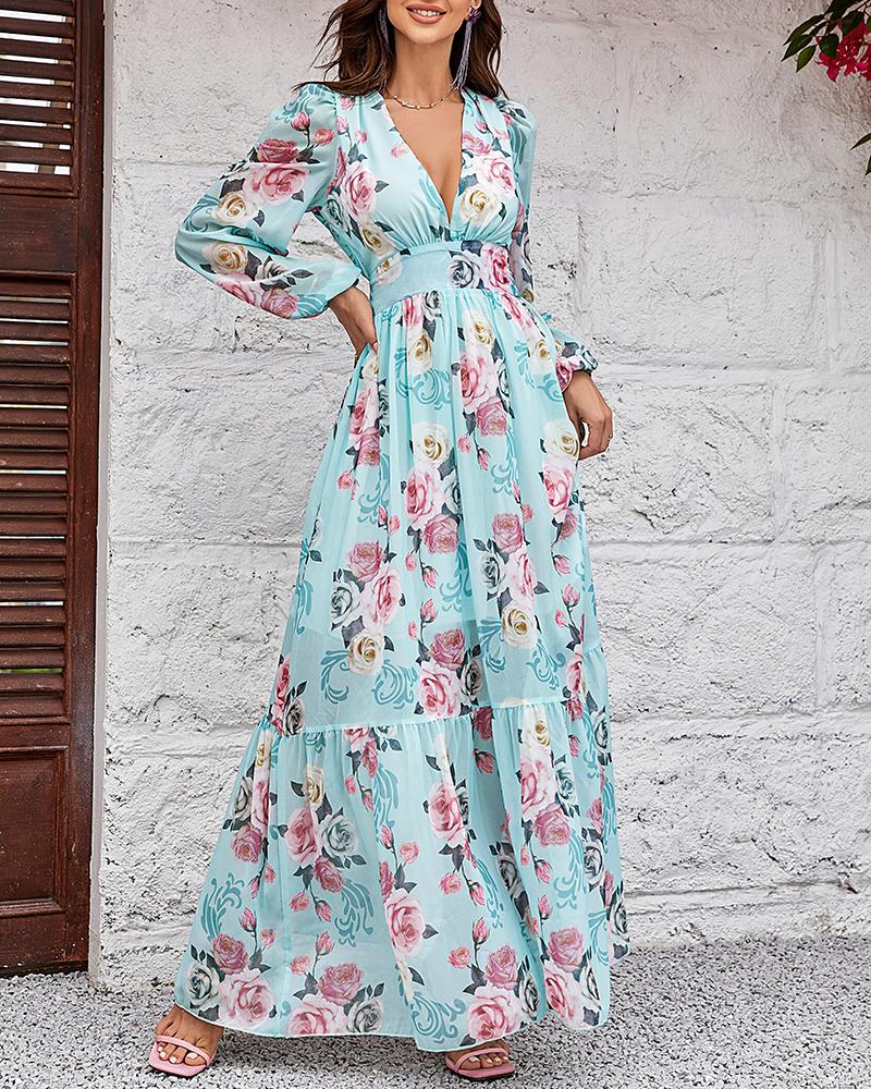 Style:Casual,Chic Type:A Line Material:97%Polyester,3%Spandex Neckline:Deep V Neck Sleeve Style:Lantern Sleeve,Long Sleeve Length:Maxi Pattern Type:Floral Decoration:Lantern Sleeve,Pastel Fit Type:Regular Occasion:Daily,Wedding Guest Package Include:1* Dress Fabric Elasticity:Non-Stretch Sheer:No Care Instructions:Machine wash or professional dry clean