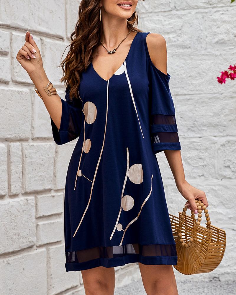 Geometric Print Contrast Mesh Cold Shoulder Casual Dress