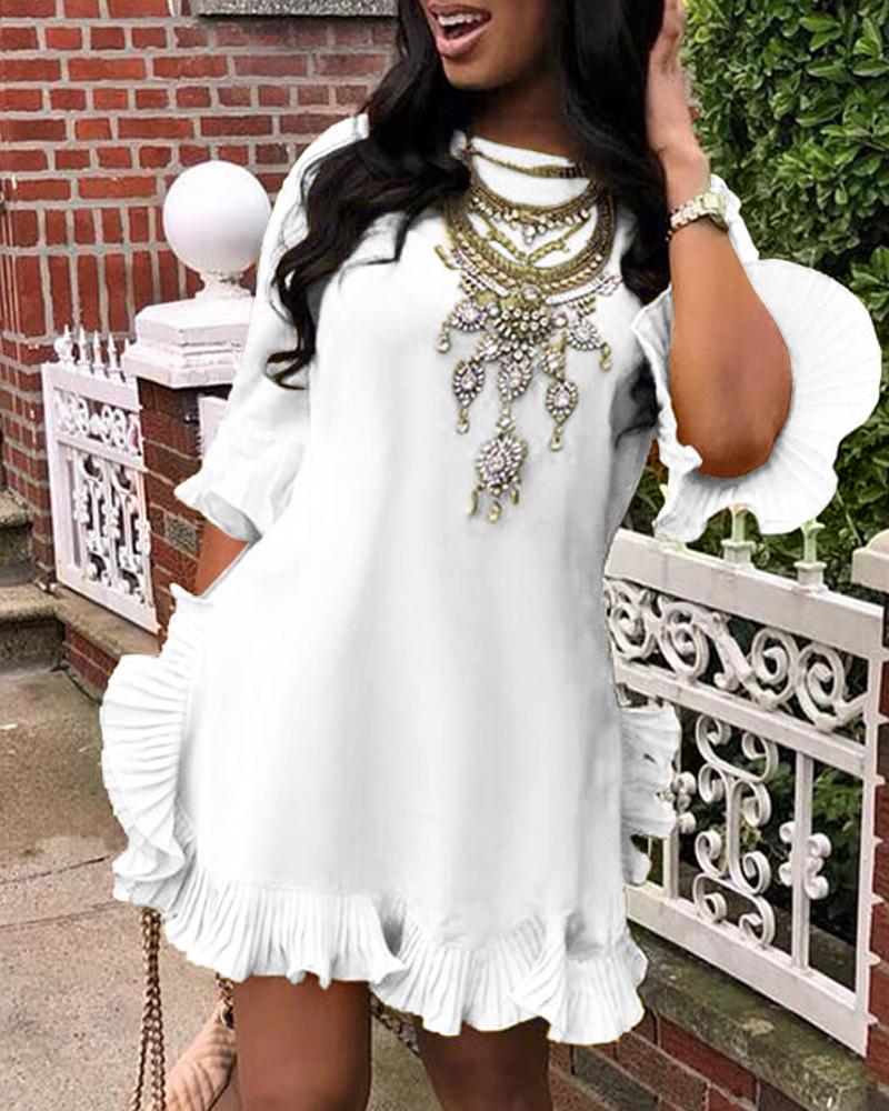 Style:Chic Type:A Line Material:100%Polyester Neckline:Round Neck Sleeve Style:Bell Sleeve,Three Quarters Length:Mini Pattern Type:Plain Decoration:Ruffles Fit Type:Regular Occasion:Daily Package Include:1* Dress Fabric Elasticity:Slight Stretch Sheer:No Care Instructions:Machine wash or professional dry clean Waist Line:Natural