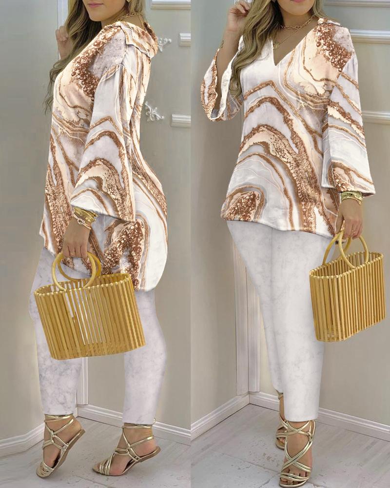 Marble Print Bell Sleeve V-Neck Casual Top & Pants Set