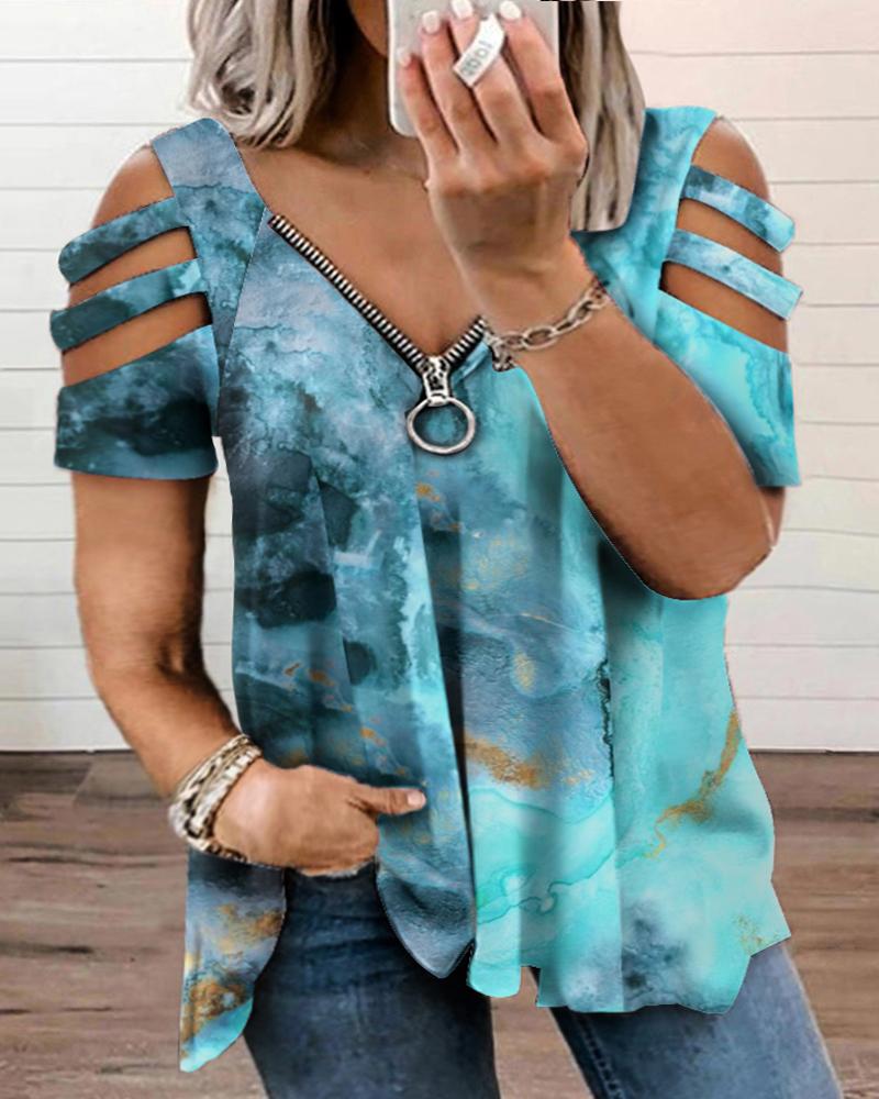 Style:Casual,Chic Type:Tee Material:97%Polyester,3%Spandex Neckline:Cold Shoulder Sleeve Style:Short Sleeve Length:Regular Pattern Type:Marble Decoration:Cutout,Zipper Fit Type:Regular Occasion:Daily Package Include:1*T-Shirt Fabric Elasticity:Non-Stretch Sheer:No Care Instructions:Machine wash or professional dry clean