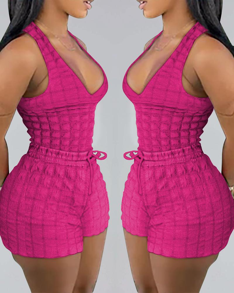 Style:Casual Type:Shorts Set Material:97%Polyester,3%Spandex Neckline:V-Neck Sleeve Style:Sleeveless Length:Above Knee Pattern Type:Plain Decoration:Drawstring Fit Type:Skinny Occasion:Daily Package Include:1*Shorts Set Fabric Elasticity:High Stretch Sheer:No Care Instructions:Machine wash or professional dry clean Waist Line:High Waist