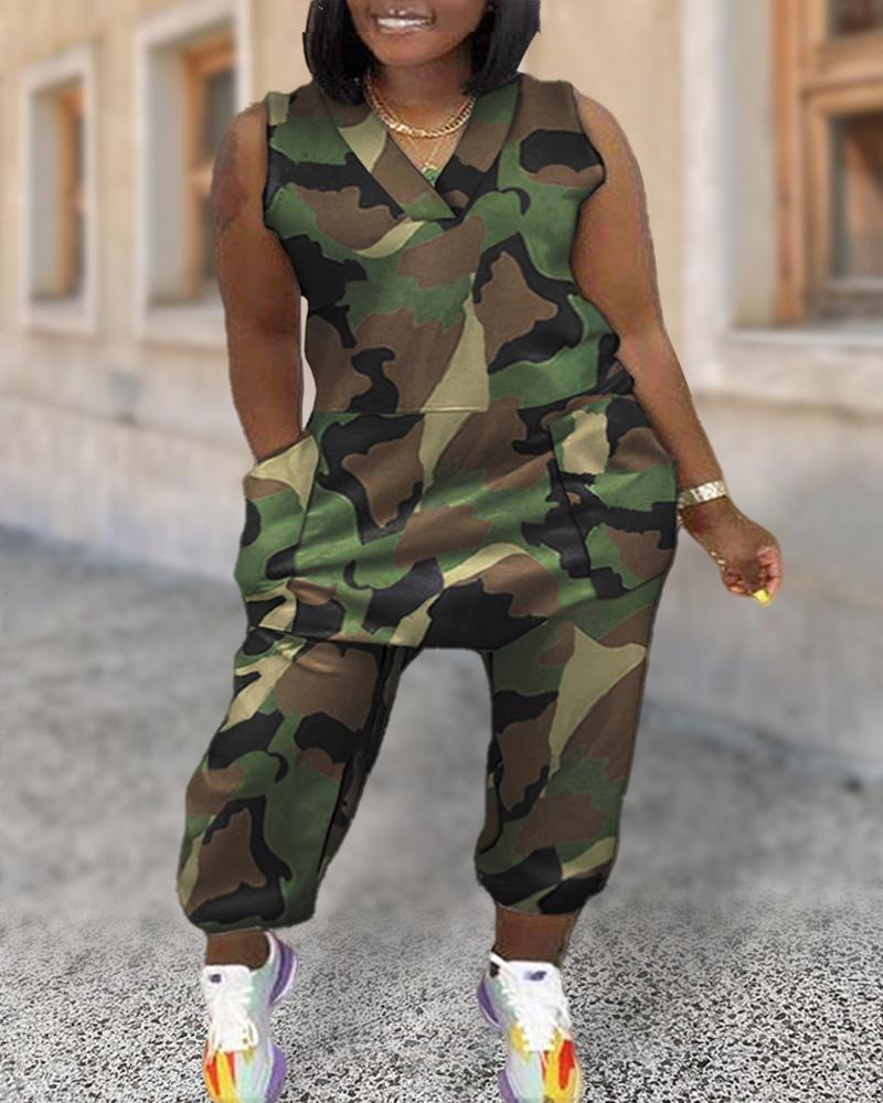 Plus Size Camouflage Print Sleeveless Pocket Design Jumpsuit