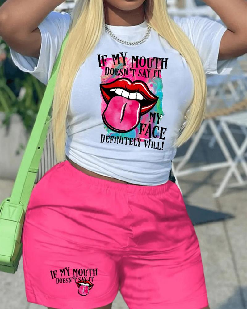Lip Tongue Letter Print Short Sleeve Top & Shorts Set