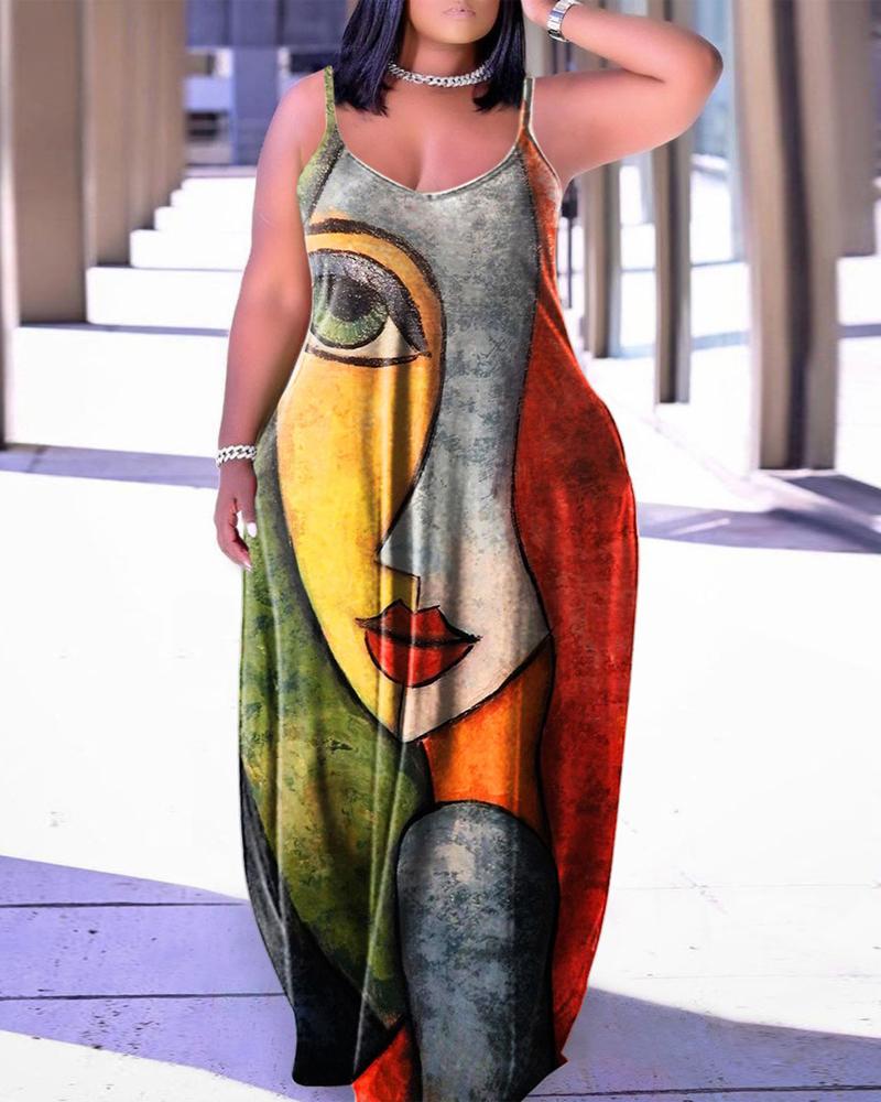 Style:Casual Type:Straight Material:97%Polyester,3%Spandex Neckline:V-Neck Sleeve Style:Spaghetti Strap Length:Maxi Pattern Type:Abstract,Figure Decoration:Others Fit Type:Oversized Occasion:Daily Package Include:1* Dress Fabric Elasticity:Non-Stretch Sheer:No Care Instructions:Machine wash or professional dry clean