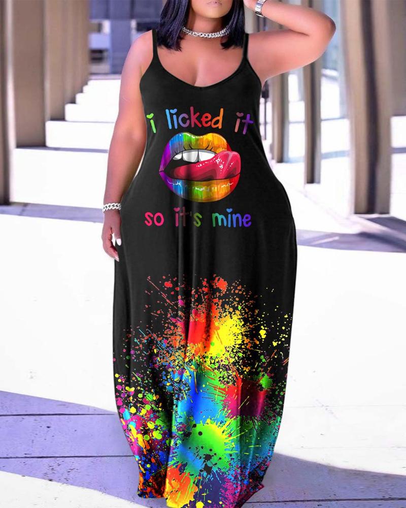 Style:Casual Type:Straight Material:97%Polyester,3%Spandex Neckline:V-Neck Sleeve Style:Spaghetti Strap Length:Maxi Pattern Type:Lip,Letter,Ink Splash Fit Type:Oversized Occasion:Daily Package Include:1* Dress