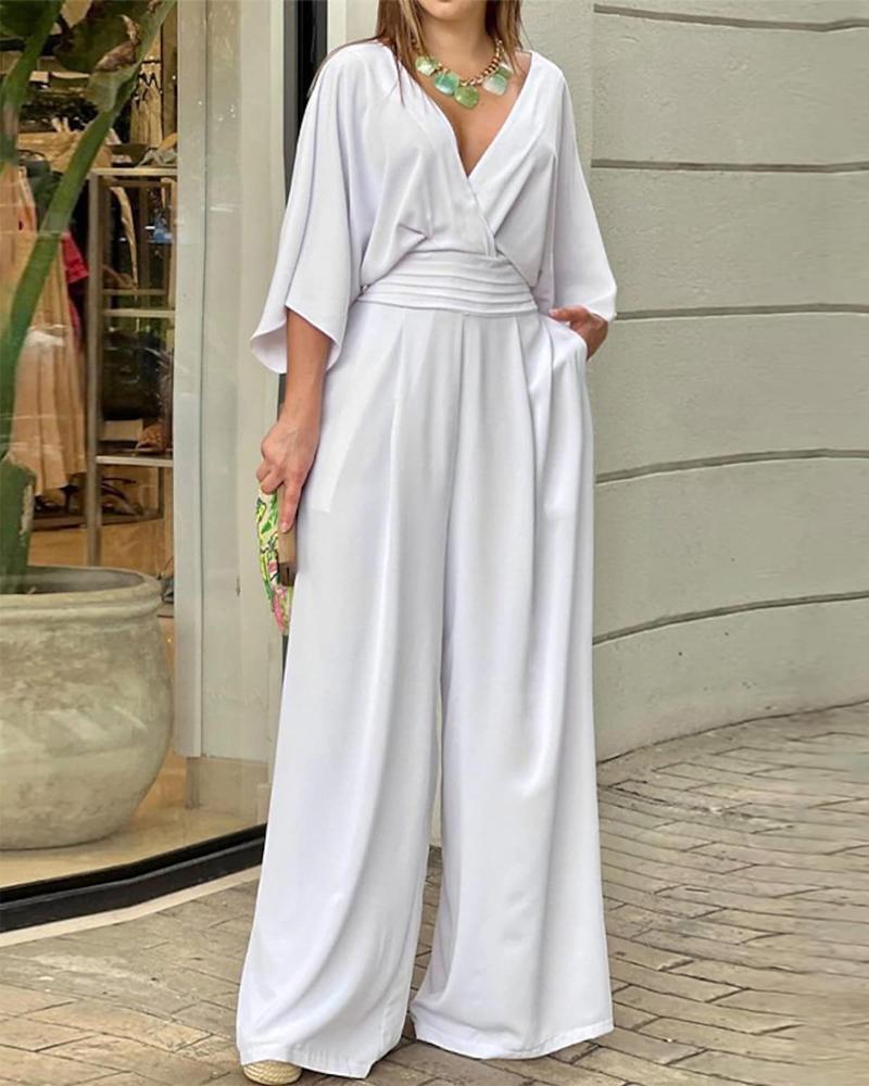 Style:Casual Type:Jumpsuit Material:100%Polyester Neckline:V-Neck Sleeve Style:Batwing Sleeve,Three Quarters Length:Long Pattern Type:Plain Decoration:Pocket Fit Type:Oversized Occasion:Daily Package Include:1*Jumpsuit