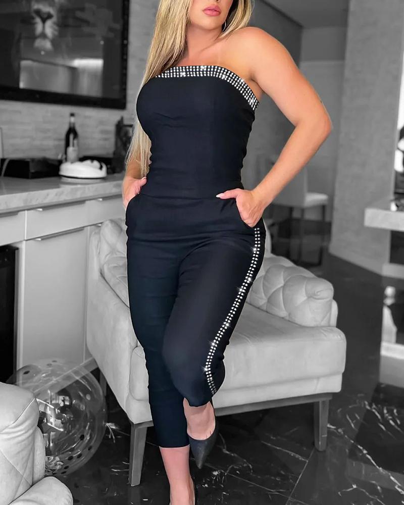 Rhinestone Decor Strapless Bandeau Jumpsuit