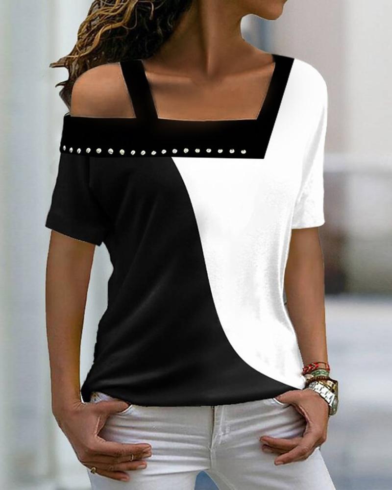 Style:Casual Type:Tee Material:97%Polyester,3%Spandex Neckline:Asymmetrical Neck,Cold Shoulder Sleeve Style:Short Sleeve Length:Regular Pattern Type:Colorblock Decoration:Rhinestone Fit Type:Regular Occasion:Daily Package Include:1*T-Shirt